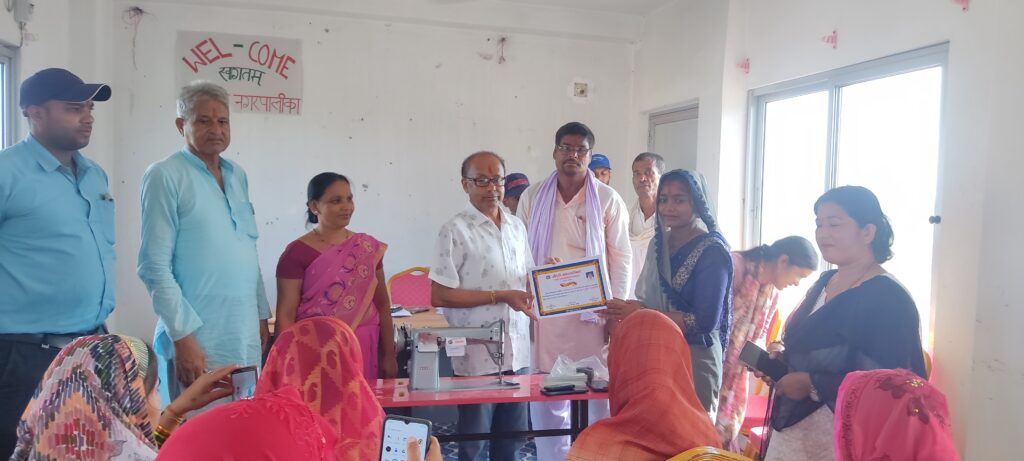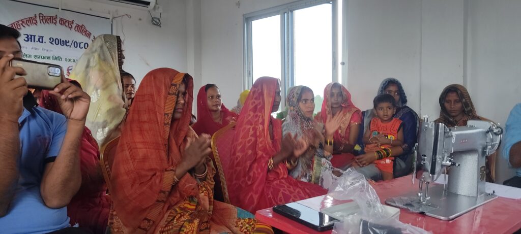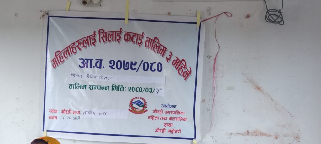 धर्वेन्द्र कुमार यादव ‘यदुवंशी’ ,श्रावण १ गते । औरही नगरपालिकाकाे महिला बालबालिका तथा जेष्ठनागरिक शाखाद्वारा वडा १ र २ मा संचालन गरिएको ३ महिने सिलाई कटाई तलिम आइतवार सम्पन्न भएको छ । तालिममा सहभागी १९ जना महिलाहरुलाई समापन समारोहमा प्रमाणपत्र सहित एक-एक थान सिलाई गर्नका लागि मेसिन समेत औरही नगरपालिकाले उपलब्ध गराएको छ