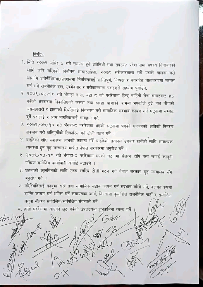 उका अनुसार असमझदारी र झडपको स्थितिलाई नियन्त्रण गरी सामाजिक सद्भाव कायम गर्न घटनामा सम्बद्ध दुबै पक्षलाई र आम नागरिकलाई आह्वान गर्ने सहमति भएको छ ।